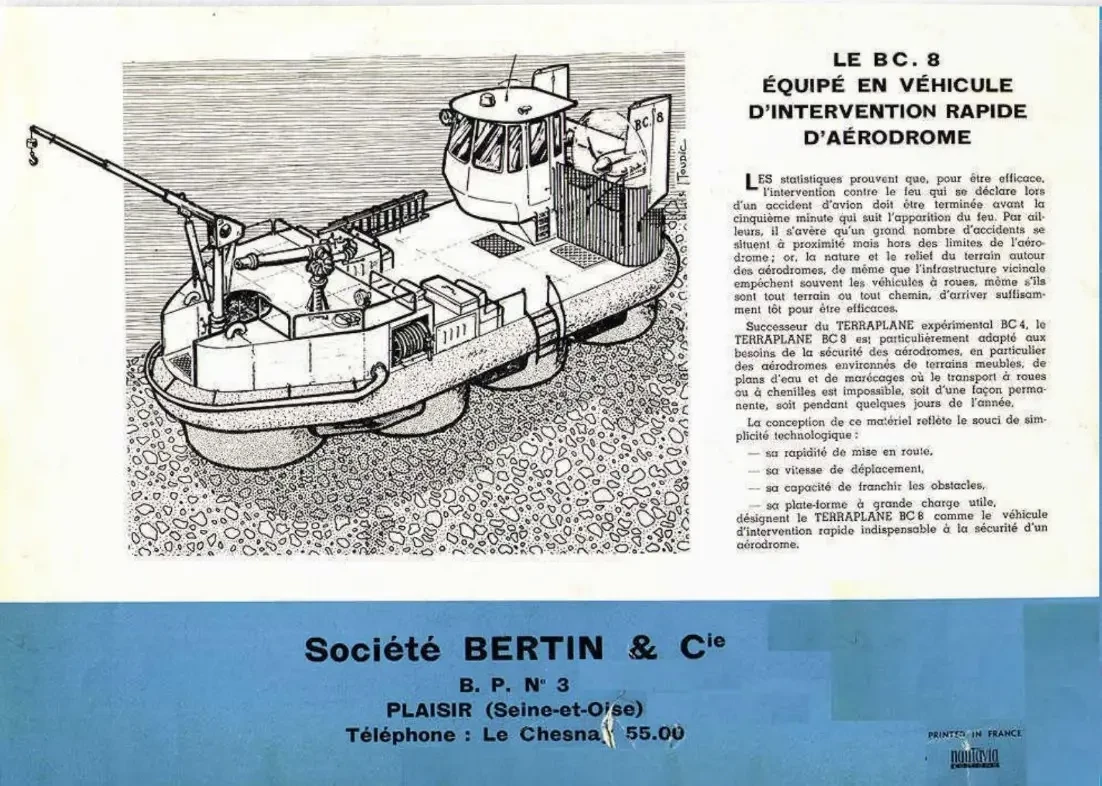 Кстати, о разработчике Terraplane. Французская контора Bertin & Cie была типичным стартапом в современном понимании. Разумеется, в реалиях середины 50-х годов прошлого столетия. Основатель Жан Бертен до поры до времени трудился в двигателестроительной SNECMA, а в 1955 году ушел на вольные хлеба, прихватив еще 15 сотрудников. Новообразованная Bertin & Cie стала первой во Франции, кому удалось построить машину на воздушной подушке. Только это был не наш герой BC7, а предшественник Terraplane BC4.