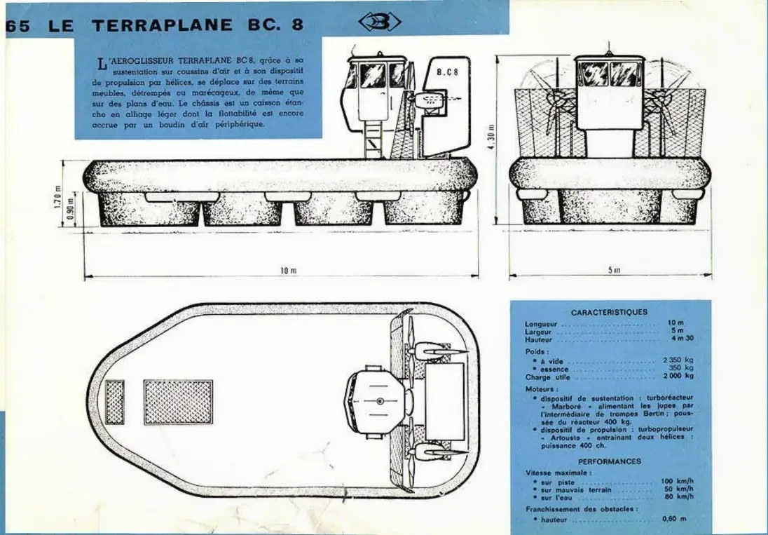 Именовалась она Terraplane BC6 (кто-то потеряли промежуточный индекс BC5) и неё отсутствовал турбореактивный двигатель. Взамен аппарат получил пару бензиновых оппозитных Porsche и один дизель Panhard. Это значительно повысило топливную экономичность BC6, а заодно и сопутствующий шум. Первые два отвечали за нагнетание воздуха под днище, дизель обеспечивал движение. Внешность у аппарата получилась своеобразная – что-то среднее между катером, тепловозов и баржей. Terraplane все также опирался на восьми гибких фартуков, но дополнительно получил по одному колесу спереди и сзади. Они должны были направлять транспортное средство по курсу и обеспечивать торможение конструкции полной массой в три тонны. Заднее колесо было ведущим, крутящий момент на него подавался от дизеля Panhard. Вместе с фирменной системой Бертане с отклоняемыми фартуками, это обеспечивало уверенную тягу. На стоянке при неработающем двигателе BC6 опирался на четыре колеса от гипертрофированной тележки из супермаркета. Кабина экипажа больше походила на рубку, но защищала от ветра и осадков. Аппарат появился на свет в 1963 году, мог ходить (или летать?) автономно до 200 км с грузом массой в 1400 кг. Очень неплохо, если учесть, что снаряженная масса BC6 составляла 1600 кг. На суше машина делала 70 км/ч, на воде – 25 км/ч.
