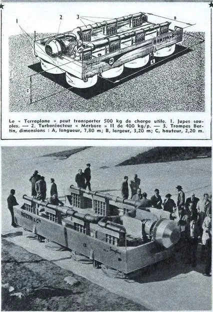 Terraplane BC4 совсем не походил на транспортное средство для дорог общего пользования. Это была грузовая платформа, размещенная на восьми гибких юбках или фартуках, в которые нагнетался воздух. Всё это хозяйство приводилось в движение реактивным двигателем Turbomeca Marbore. Уникальность конструкции Жана Бертена заключалась в этих самых фартуках, которые могли наклоняться в любую сторону. Угол наклона был небольшой, но он позволял машине на воздушной подушке разгоняться до нескольких десятков километров в час. При этом судно парило над поверхностью на высоте 3-4 см. Получался корабль со своеобразной системой изменяемого вектора тяги.