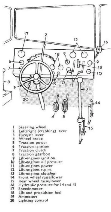 Оператор BC7 мог тонко настраивать работу аппарата. В самых тяжелых условиях машина шла на воздушной подушке, колеса втягивались в арки и лишь направляли машину. На воде они опускались полностью и обеспечивали поступательное движение. Варьируя рычагами в кабине, оператор мог передавать на колеса от 5 до 50 процентов массы машины. Когда воздушная поддержка не требовалась, BC7 полностью переходил на колесный ход. Как уже стало понятно читателю, от изменяемого вектора тяги фартуков под днищем конструкторы отказались – эту функцию на себя взяли колеса.