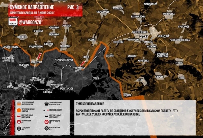 На Сумском направлении ВС РФ продолжают работу по созданию буферной зоны. Есть тактическое успехи российских войск в Юнаковке. ВСУ продолжают попытки атаковать наши позиции в районе Тёткино, но каждый раз накаты заканчиваются уничтожением личного состава и техники противника.
