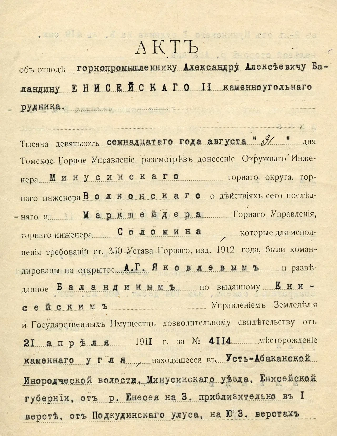 Акт об отводе Енисейского каменноугольного рудника, находящегося в Усть-Абаканской инородческой волости. КККМ ОФ 12376/5