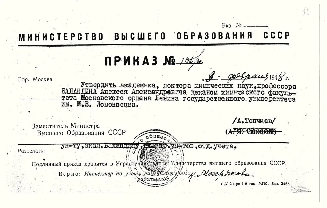 Академика Баландина освободили и реабилитировали в 1953 г. благодаря ходатайству его учителя Н.Д. Зелинского.