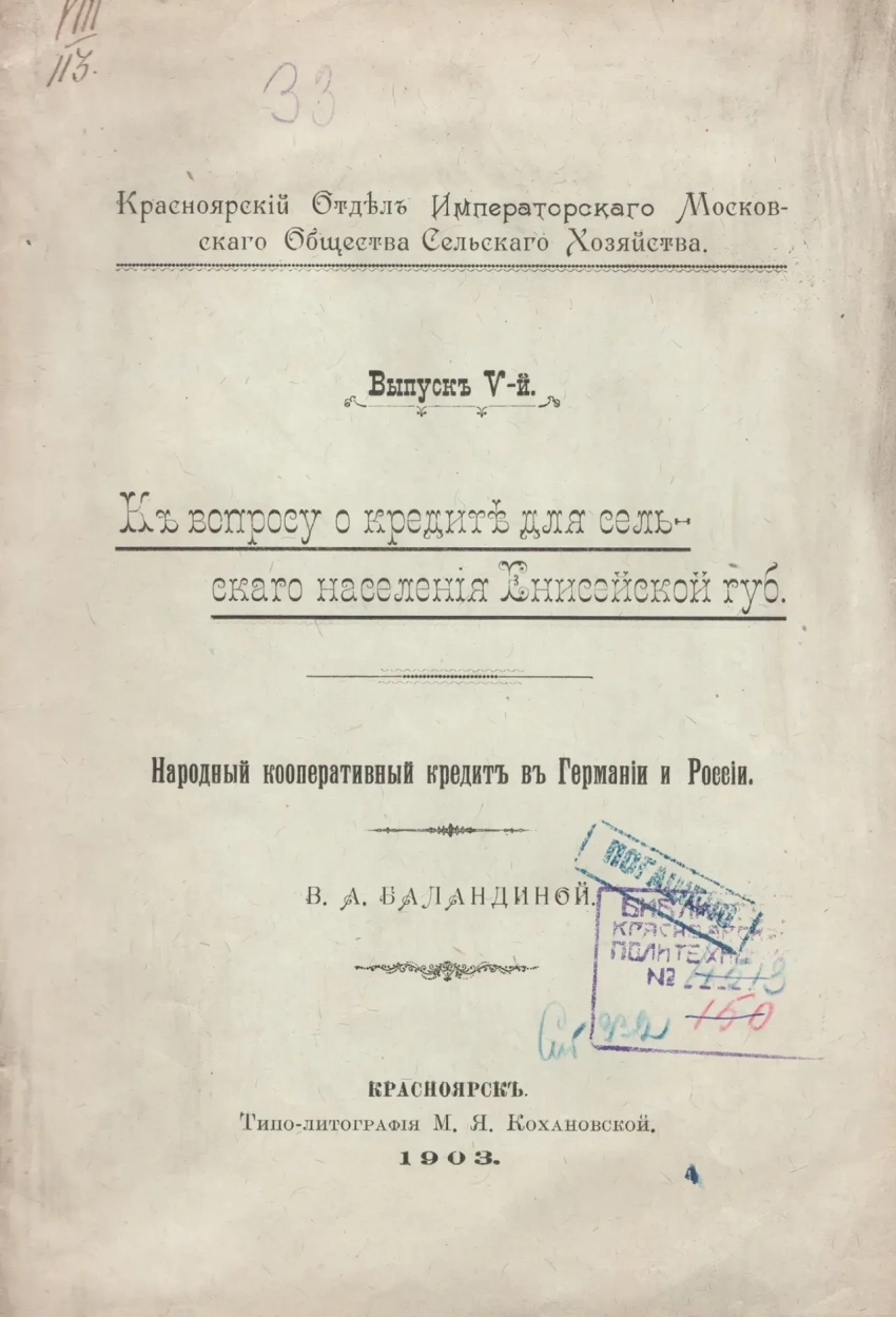 Брошюра. Баландина В.А. К вопросу о кредите для сельского населения Енисейской губернии. КККМ ОФ 10074/228