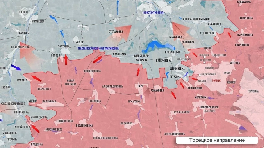 Западнее Торецка продолжаются бои в Яблоновке и Александро-Калиново. Севернее Торецка ВС РФ стараются пробиться к Нелеповке.