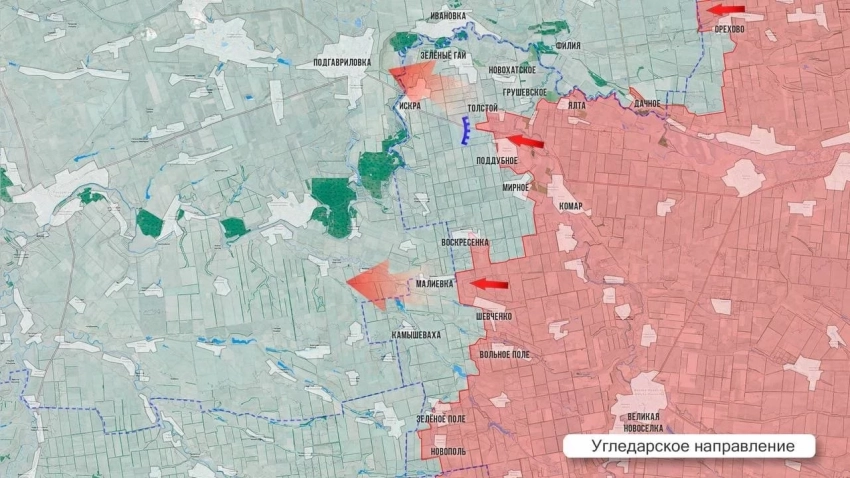 На Угледарском направлении ВС РФ продвинулись примерно на 1,5 км от Зелёного Поля в сторону Темировки, а также западнее Вольного Поля, расширяют зону контроля западнее Шевченко к Камышевахе, выдавливать ВСУ с востока на запад к Воскресенке. Чуть выше по фронту наши продвинулись к западным окраинам Мирного, которое ранее называлось поселком Карла Маркса, большая часть уже под нашим контролем. Ещё выше ВС РФ продвинулись к северо-востоку от ранее освобождённого Толстого, до 1 км в глубину и по фронту.