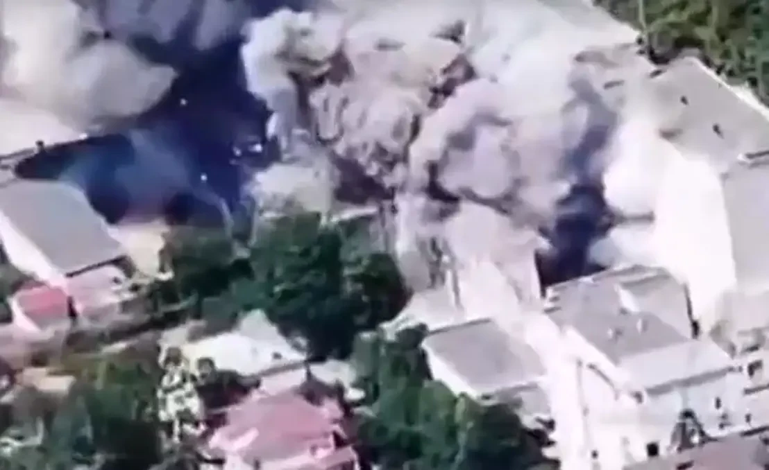 В сети распространяются кадры, на которых запечатлён точный прилёт двух КАБов прямо по вышеупомянутому зданию. Затем была заметна повторная детонация.