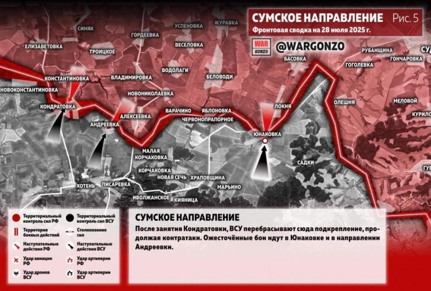 Сумское направление: после занятия Кондратовки, ВСУ перебрасывают сюда подкрепление, продолжая контратаки. Ожесточённые бои идут в Юнаковке и в направлении Андреевки.