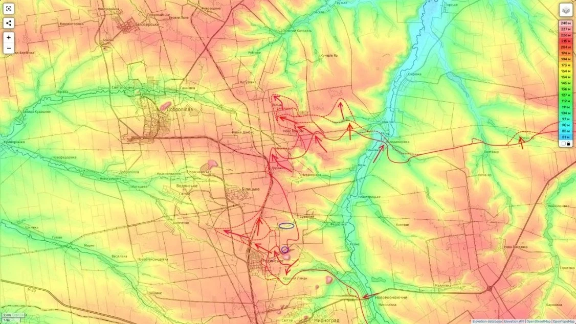 На пока им удалось здесь только стабилизировать фронт. А между тем, отсутствие нужного количества резервов привело к тому, что фронт севернее (в полосе 51А) у ВСУ продолжает сыпаться и мы уже здесь очень глубоко вклинились между Родинским и Билыцьким. А также движемся на Доброполье и обходим Шаховое (карта 2).