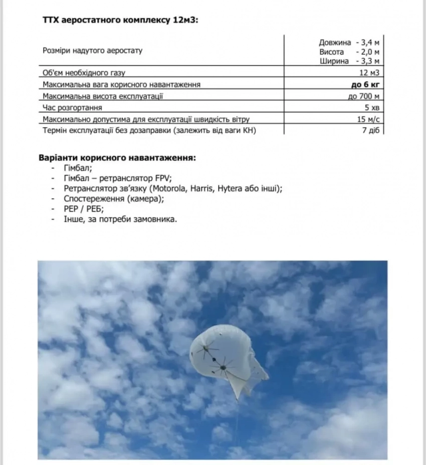 Аэростатный комплекс такого типа, производимый на территории Украины, предназначен для выполнения функций ретранслятора FPV-дронов, ретранслятора для осуществления связи, а также для использования в качестве «устройства подвеса» контейнера РЭБ. Кроме того, AB12 может использоваться и как средство для осуществления аэрофотовидеофиксации – то есть, как разведывательное средство.