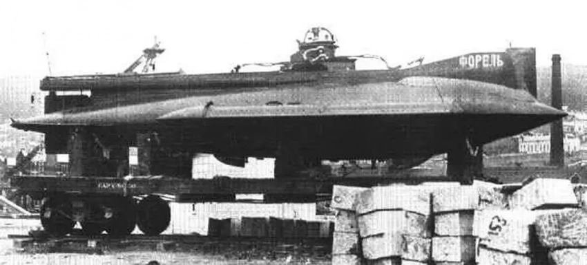 Зато «Форель» обладала огромным достоинством: она помещалась на железнодорожную платформу. Остальные «немки» были построены по проекту «Е» и получили имена «Карп», «Карась» и «Камбала». Это были достаточно крупные подлодки надводным водоизмещением в 205 и подводным в 236 тонн, вооружённые 1 торпедным аппаратом калибра 457 мм. Они были оснащены двумя 200-сильными керосиновыми двигателями и двумя 200-сильными электродвигателями и способны развить скорость 10 узлов над водой и 8,5 узлов под водой.