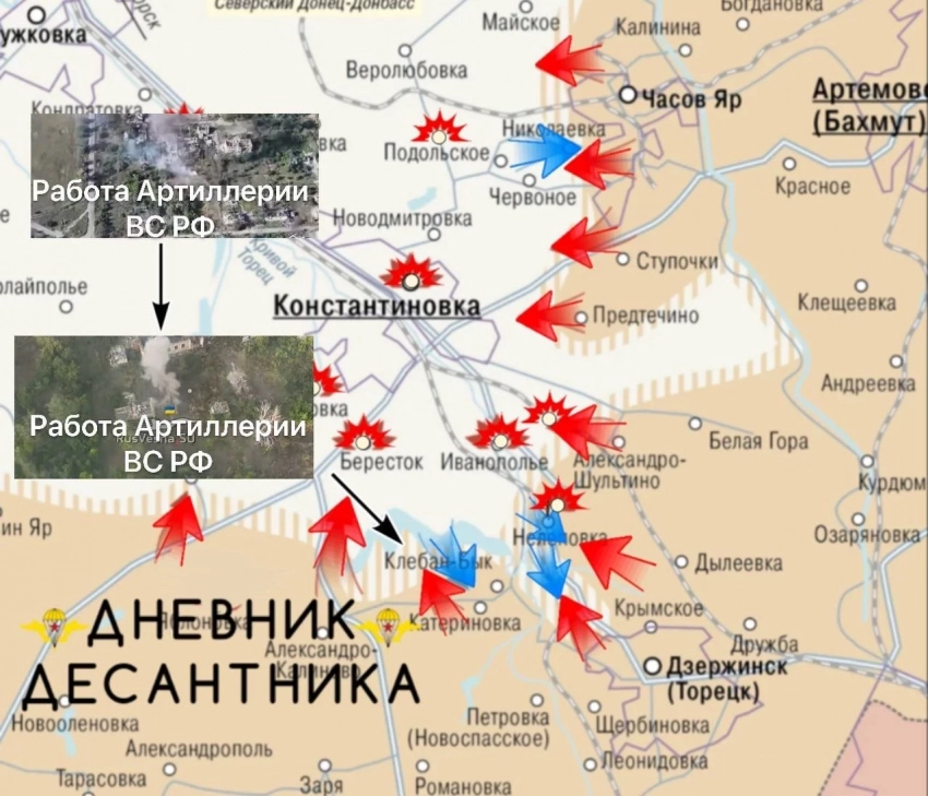 На Константиновском направлении наиболее интенсивные бои идут севернее Торецка в районе Белой Горы и Александро-Шультино, где ВС РФ постепенно расширяют подконтрольную территорию. Противник контратаковал к западу от Предтечино. Севернее Часов Яра ВС РФ продвигаются в районе Майского. Наши лётчики нанесли серию авиаударов по промзоне Краматорска.