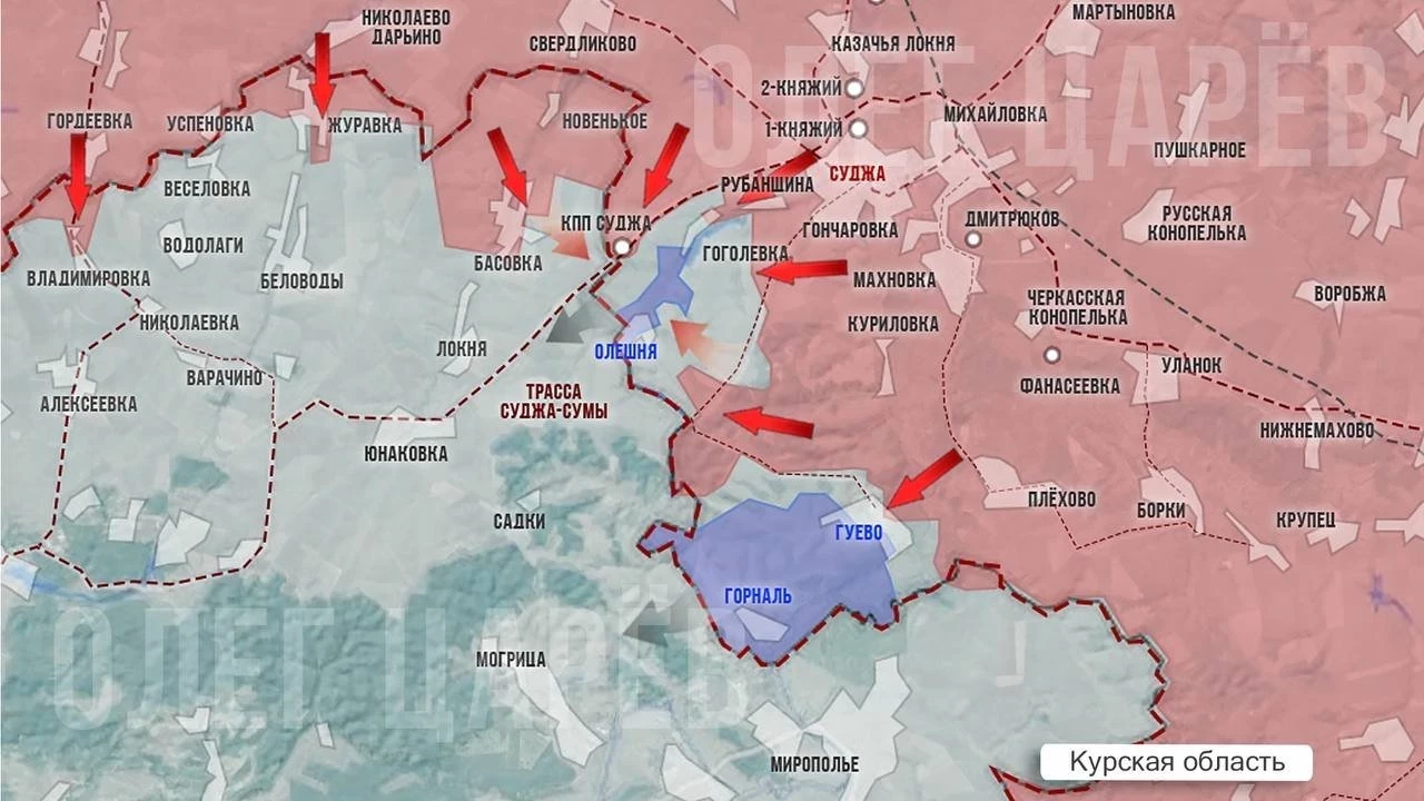 В Курском приграничье идут интенсивные бои в Гуево, наши части форсировали реку Псёл. Также Вооружённым силам Российской Федерации (ВС РФ) удалось ещё немного продвинуться в южной части Гоголевки.
