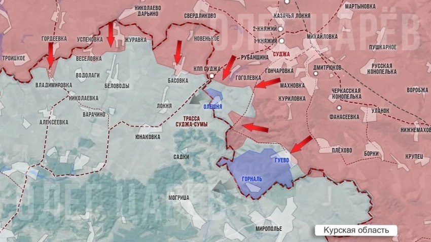 В Курской области за украинских боевиками остаются хуторы Горналь на самой границе и Олешня, к окраине которой наши бойцы уже подошли, зачистив лесные массивы у границы, отмечает в своём Telegram-канале Олег Царёв.