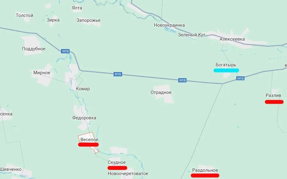 При выходе наших войск к автодороге Н15 группировка противника в районе Богатыря окажется в клещах. ВСУ сегодня не выстраивают северную линию обороны в Богатыре в расчёте на то, что ВС РФ не станут заходить с севера и форсировать реку Волчья.