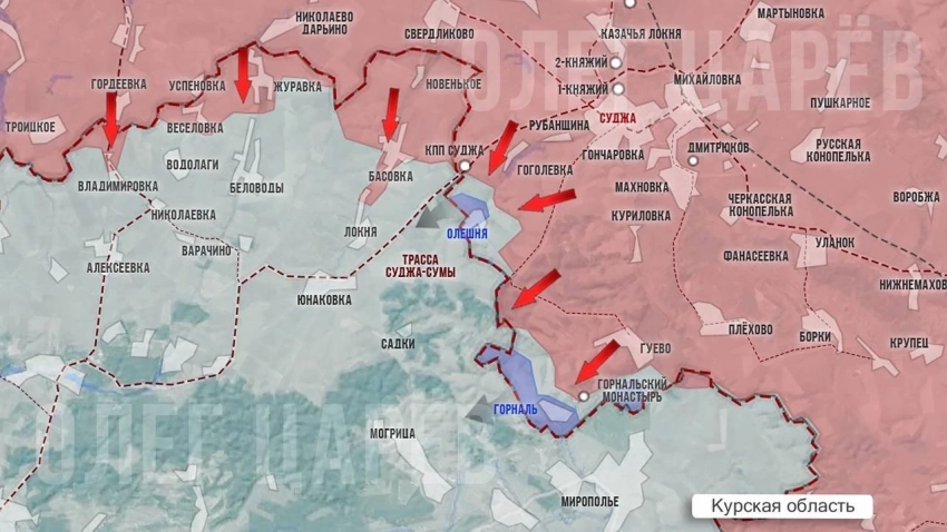 В приграничных районах Курской области российская армия ведёт бои в районе хутора Олешня и села Горналь, а также в лесных массивах у границы.