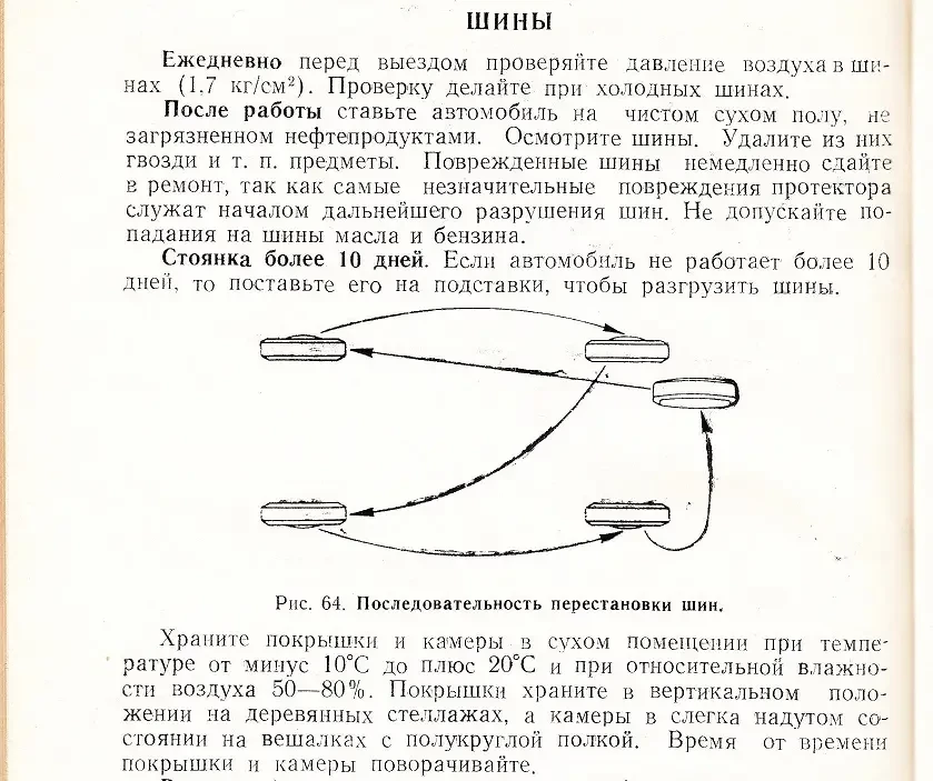 Покрышки для личных легковых автомобилей в СССР всегда были дефицитом, поэтому частники их берегли, следили за их состоянием и своевременно переставляли колёса согласно инструкции, прилагаемой к автомобилю, добиваясь равномерного износа протектора всех пяти колёс.