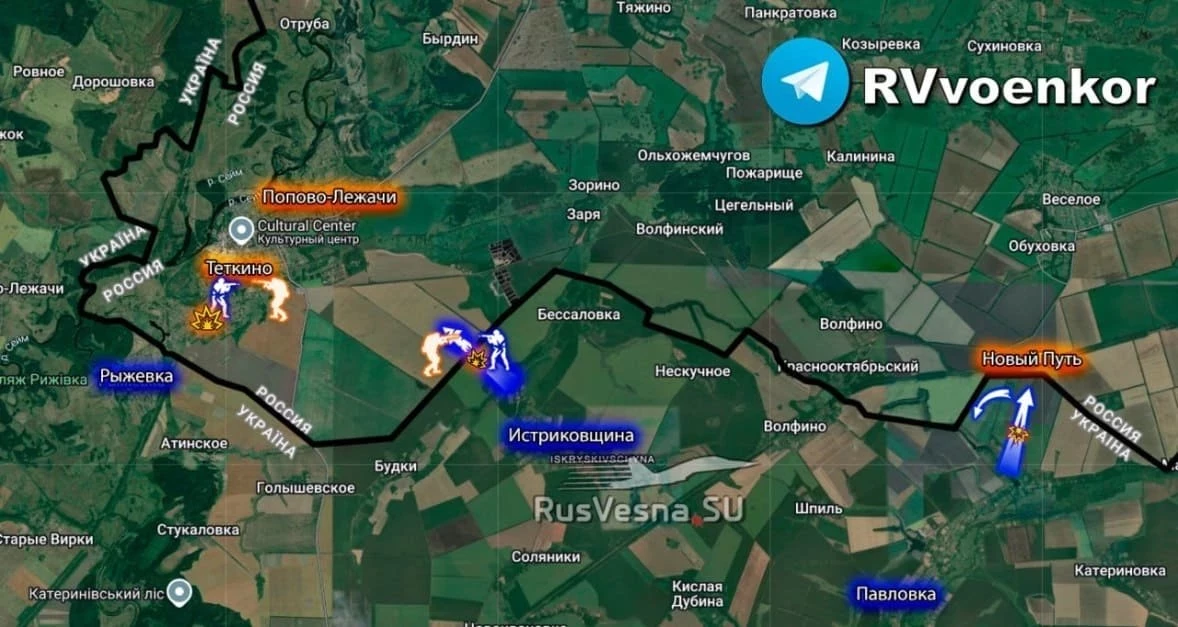 Идут интенсивные бои, обстановка меняется каждый час. Сообщают, что напротив нашего пункта пропуска «Теткино» ВСУ используют дымовые завесы, пытаясь проникнуть на свой украинский пункт пропуска. С другой стороны Теткино, на направлении Искрисковщины - Попово-Лежачи к нашему опорному пункту прорвались четыре квадроцикла с пехотой ВСУ, идут стрелковые бои. Также стрелковый бой идёт вблизи железнодорожного переезда у поселка Новый.