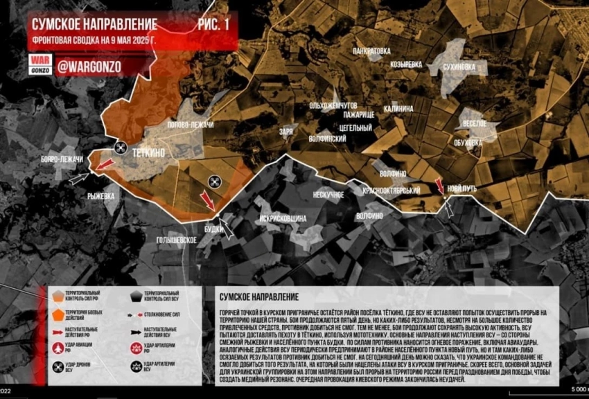 К утру 9 мая обстановка в районе Теткино остаётся напряжённой, но находится под контролем российских сил. Поступают неподтвержденные сведения о концентрации крупных сил противника в двух лесных массивах в районе села Атинское Сумской области Украины, расположенного вблизи границы. Военные эксперты предполагают, что это может свидетельствовать о подготовке к новым попыткам наступления, и российские войска усиливают разведку для проверки этой информации.