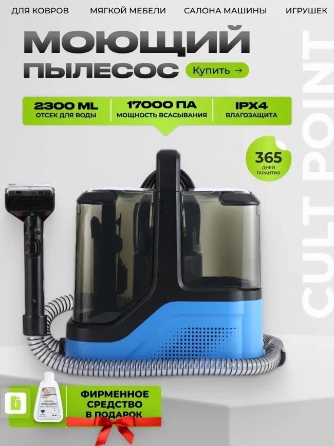 Моющий пылесос для дома Cult Point для мебели и ковров, автомобилей, игрушек, аквафильтр, мощность всасывания 17 000 Па