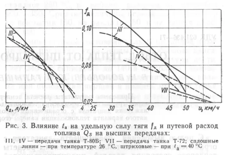 Анализ показал, что в диапазоне 25...41 °C у танка с ГТД удельная сила тяги на IV и III передачах уменьшалась на 25 и 18% или в среднем 1.8 и 1.3% с повышением температуры на один градус. У танка с поршневым двигателем при увеличении температуры воздуха с 26 до 37 °C fд уменьшилась в среднем на 10% или 0.7% на 1 °C.