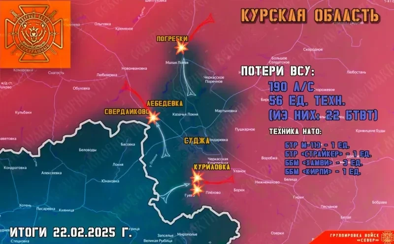 Подразделения группировки войск «Север» продолжают освобождение Лебедевки севернее Свердликово, продвигаясь к Судже. На северном фланге в районе Погребков освобождено село Марьевка. Такие новости приходят с Курского направления.