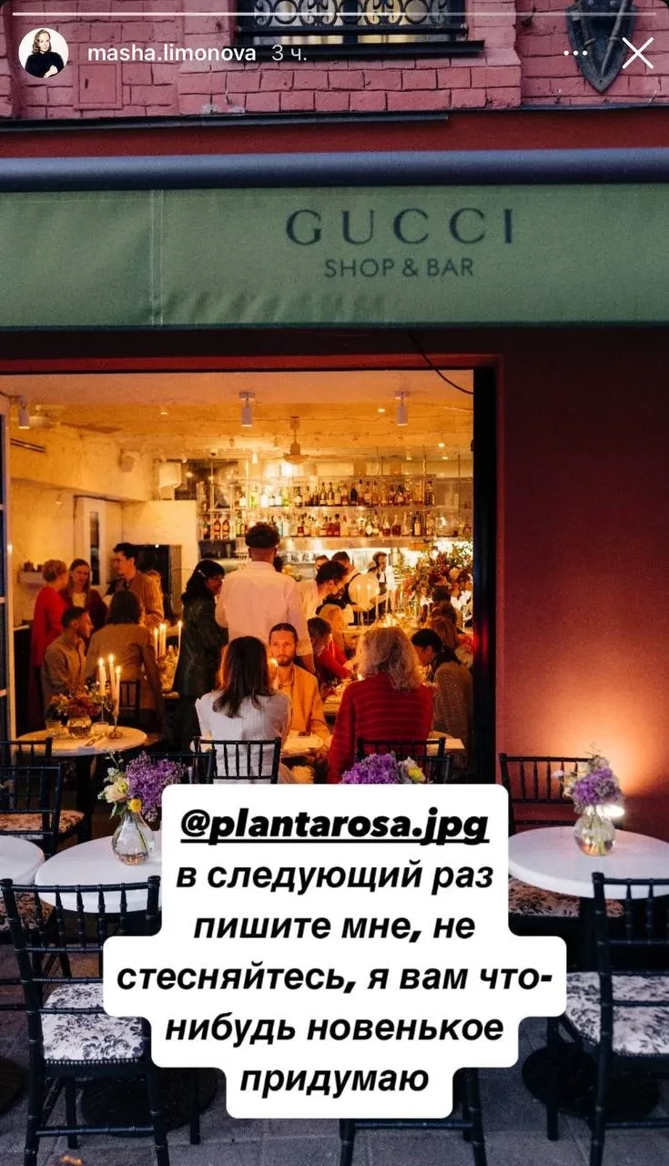 Алёна Долецкая, Мария Лимонова и Варвара Шмыкова на открытии Gucci Shop & BarВ свою очередь, телеграм-канал "Безфильтров" напомнил о контексте: "Gucci — международный гигант, Planta Rosa — молодой российский бренд", а потому сравнение кейсов некорректно из-за разницы в масштабах и бюджетах. К тому же самому ресторану как "лучшему по расположению споту района" выгодно устраивать коллаборации, и отказываться от них "в память о Gucci" попросту неразумно.
