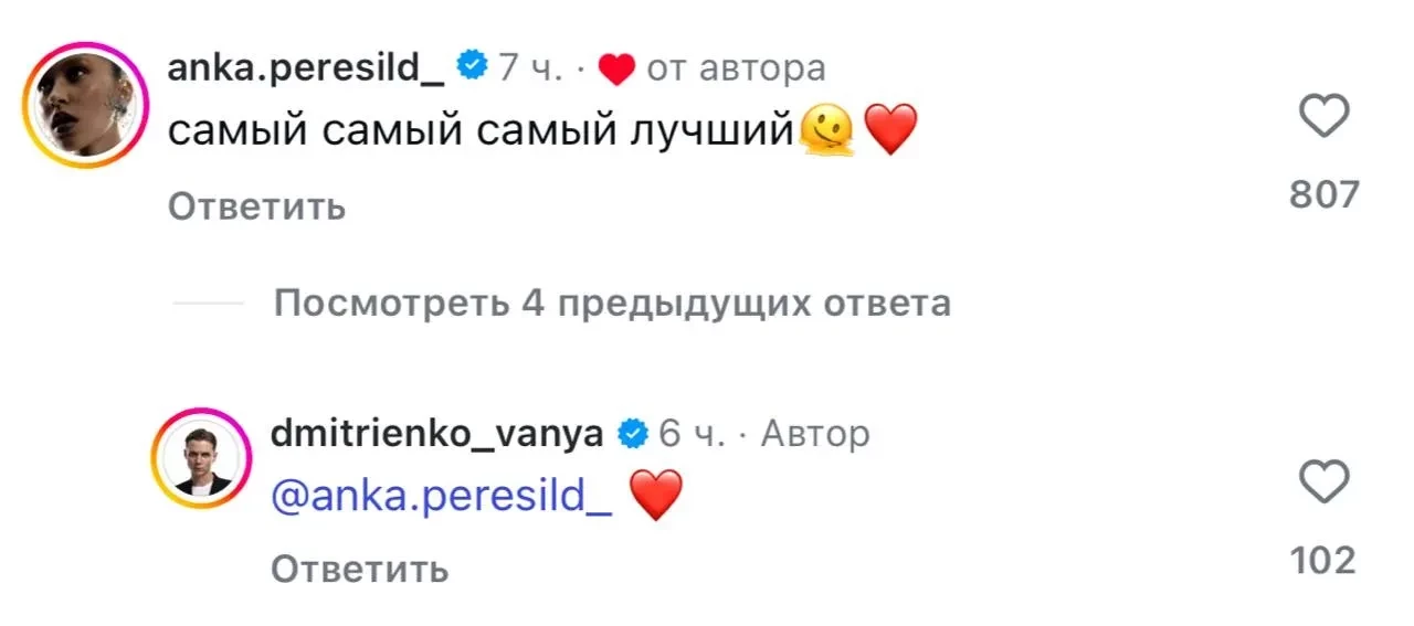 В сети обратили внимание, что недавно Анна Пересильд вновь подогрела разговоры о своих отношениях с Дмитриенко. Она появилась в комментариях под его постом в инстаграме*, где он представил новый трек. "Самый-самый-самый лучший", — написала Анна, добавив эмодзи в виде сердца (Ваня в ответ оставил такое же эмодзи).