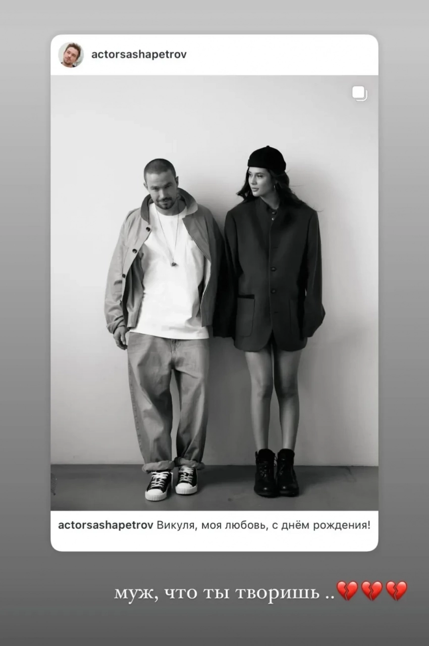 Скриншот из соцсетей Виктории АнтоновойНапомним, что Александр Петров женился на Виктории осенью 2023 года — перед этим пара сходила всего лишь на нескольких свиданий. Случившееся шокировало не только общественность, но и коллег актёра, многие из которых даже не знали, что он расстался со своей бывшей девушкой Стасей Милославской. По слухам, и сама Стася узнала о новом статусе бывшего возлюбленного незадолго до того, как он объявил о нём публично. Многие тогда раскритиковали Петрова за его поступок и выражали сочувствие Милославской.
