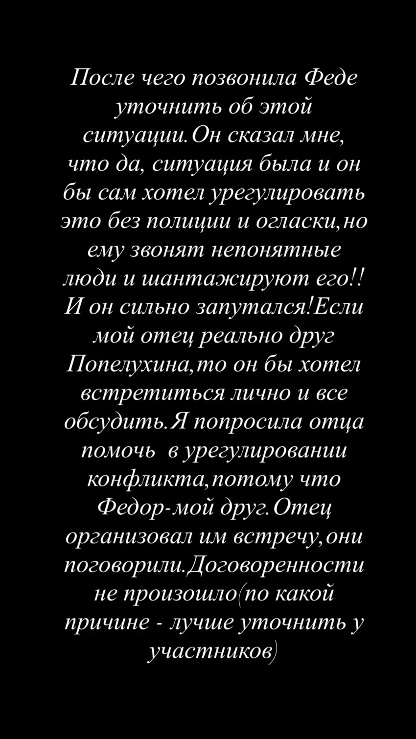 Фёдор СмоловПо её словам, спортсмен выразил готовность обсудить ситуацию напрямую, если отец Дарьи действительно знает Попелуху: "Я попросила отца помочь в урегулировании конфликта, потому что Фёдор — мой друг. Отец организовал им встречу, они поговорили. Договоренности не произошло (по какой причине — лучше уточнить у участников)".