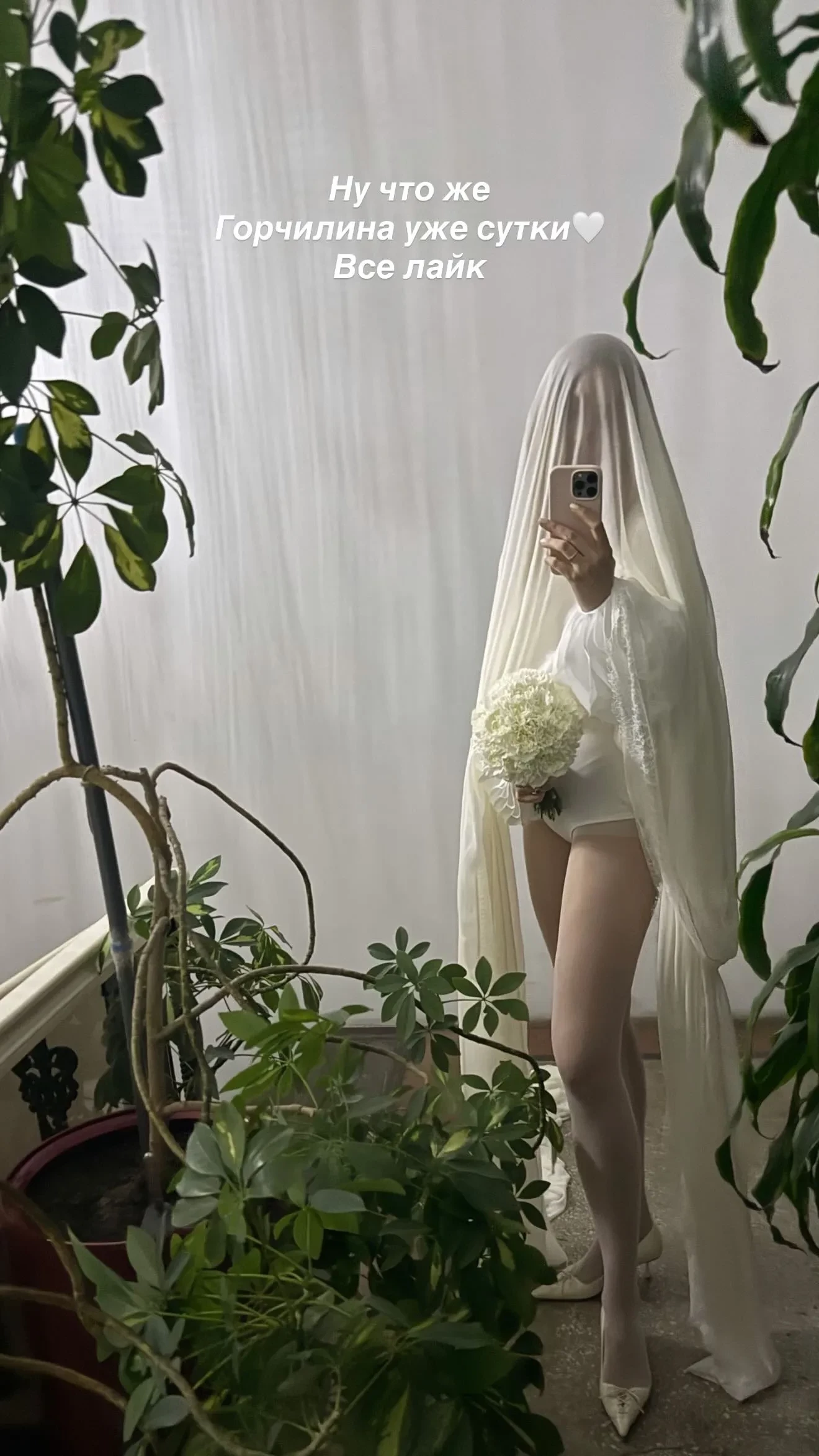 На селфи-снимке 36-летняя Мария предстала в свадебном наряде, состоящем из длинной фаты и микрошорт. "Ну что же. Горчилина уже сутки. Всё лайк", — подписала она фото.