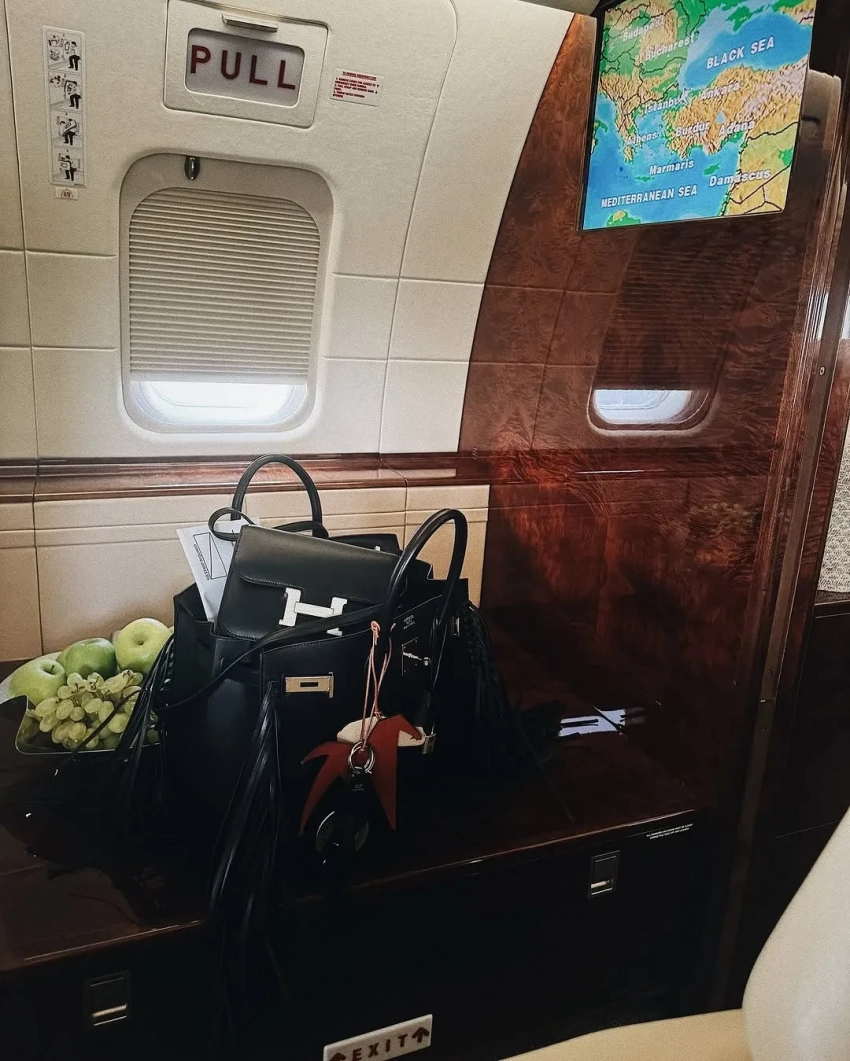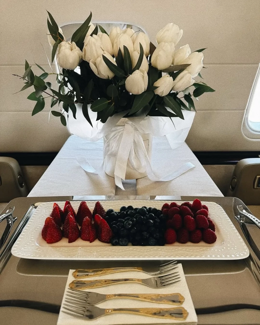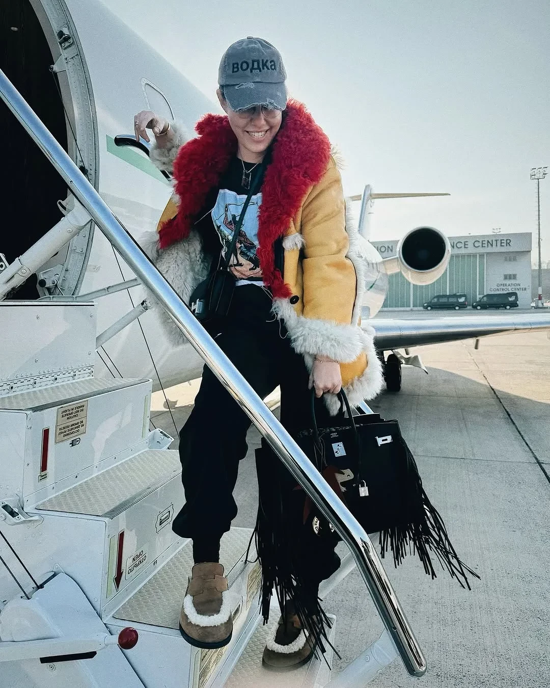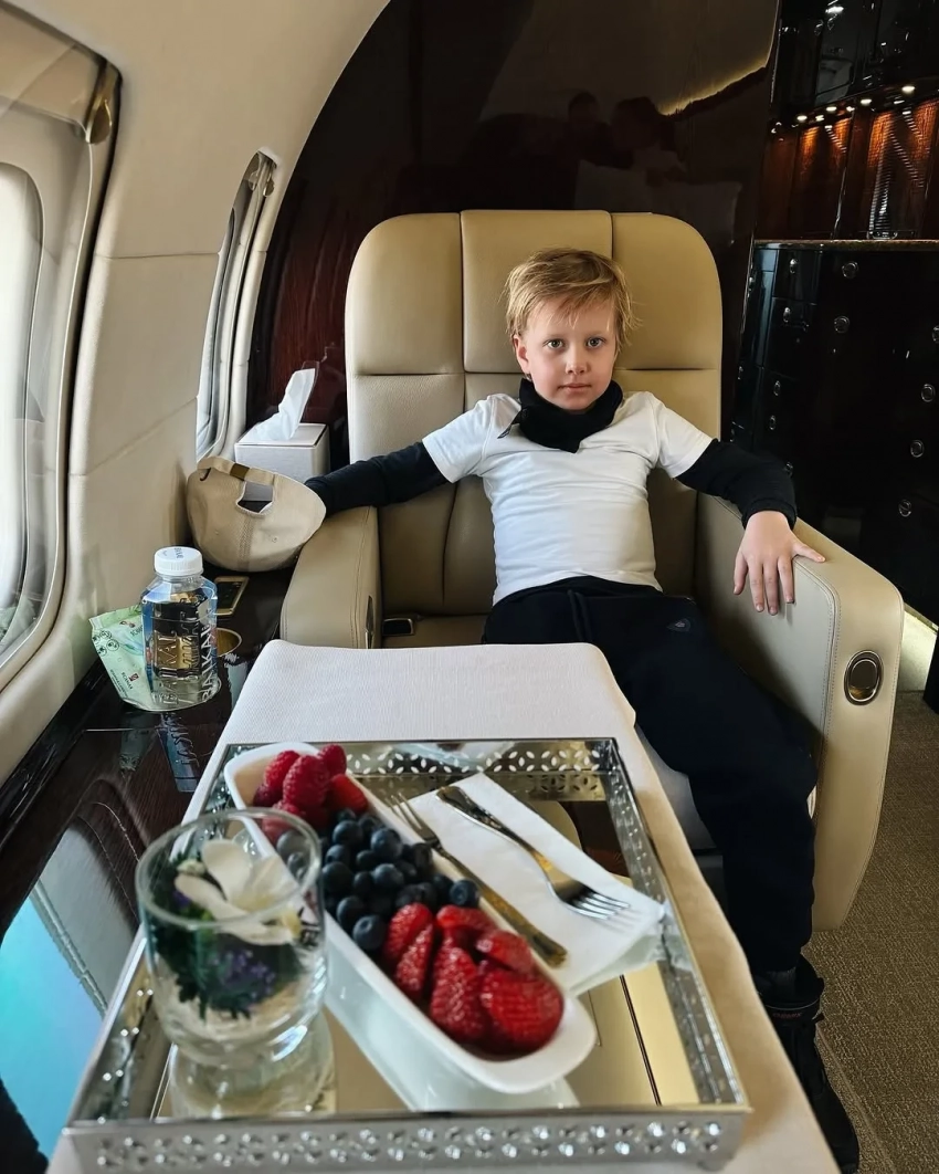 На снимках Собчак позирует у частного самолёта в дублёнке с цветным мехом, в кепке с надписью "Водка" из коллаборации концепт-стора KM20 с брендом Alexander DiGenova и с двумя сумками Hermes. На борту звезду и её восьмилетнего сына от экс-супруга Максима Виторгана встречали с цветами и угощениями.