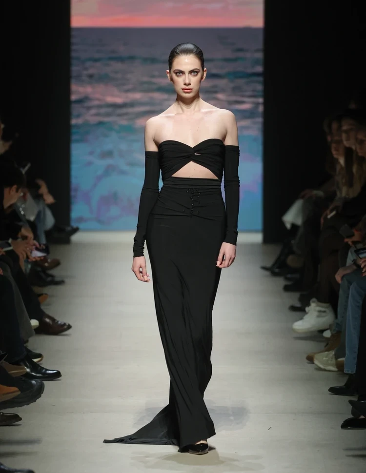 Главной звездой показа российского бренда Solangel (Москва) под руководством Ирены Сопрано стала известный блогер Дина Саева. На подиуме 25-летняя Дина появилась в вечернем алом платье в пол. В этот раз Ирена, которая специализируется на вечерних платьях, сделала упор на наряды с традиционными русскими мотивами.