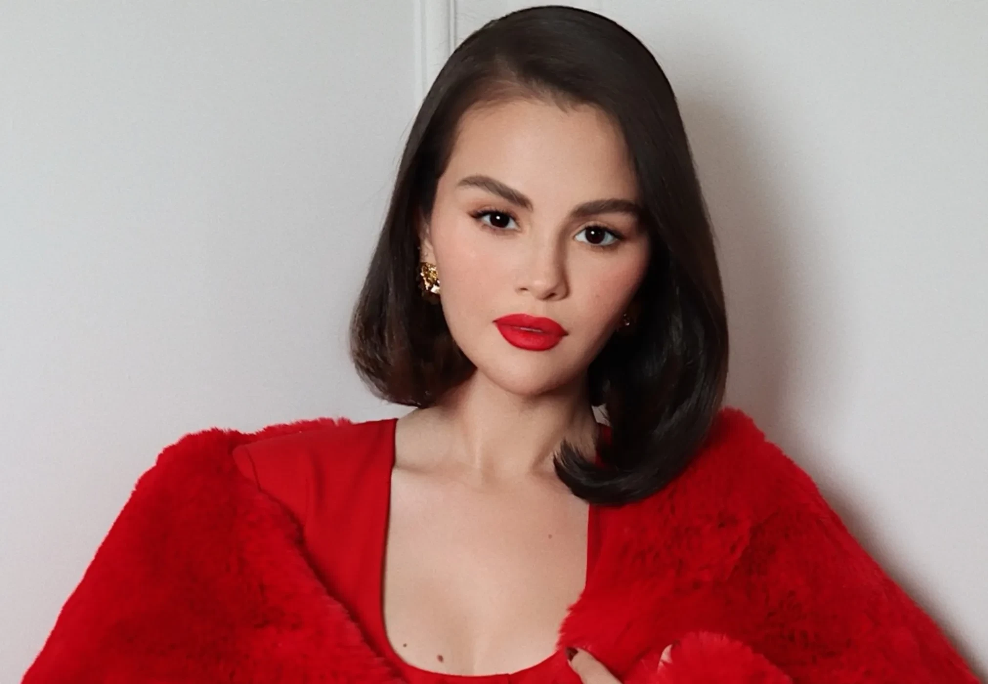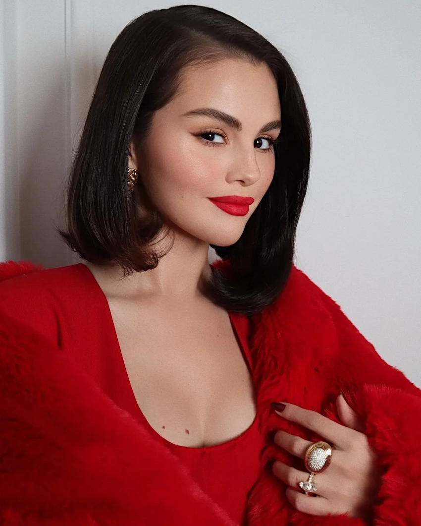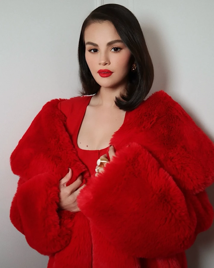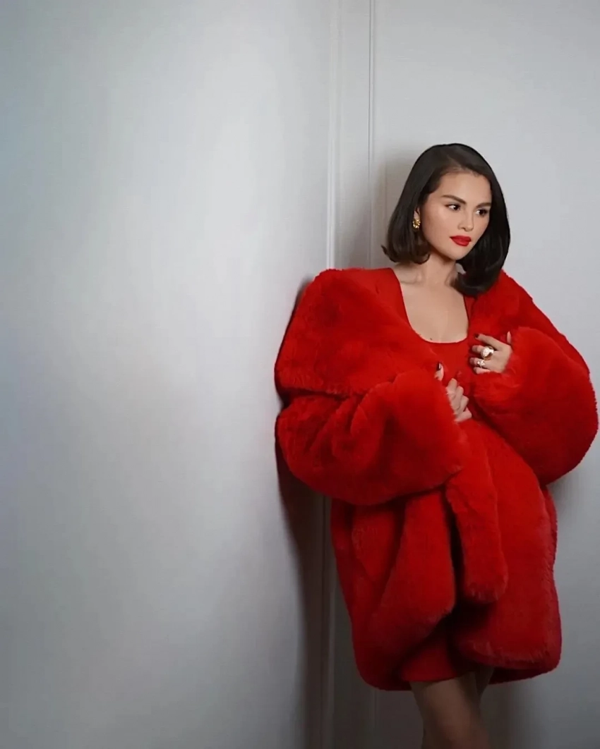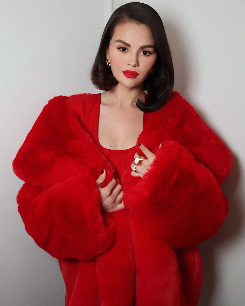 На мероприятии Селена появилась в ярко-красной шубе из искусственного меха от бренда Milkwhite, которую она накинула поверх платья с пуговицами в тон. Продолжая красную тему, Гомес дополнила образ туфлями-лодочками с острым носом и сделала маникюр в оттенке Needles & Red. Завершающим штрихом стали золотые украшения: массивное золотое кольцо и серьги, а также алая помада из коллекции её бренда Rare Beauty. Волосы артистка уложила в прямой боб с боковым пробором.