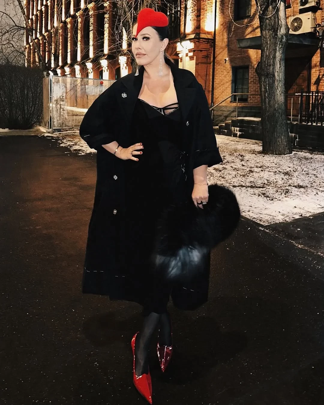 Ксения Собчак выгуляла плащ Maison Margiela с красной шляпой Planta Rosa, туфлями Acne Studios в тон и меховой сумкой. Тина Канделаки проводит последние зимние дни в шубе: под ней ведущая скрывала бархатный чёрный костюм с объёмным золотым бантом.